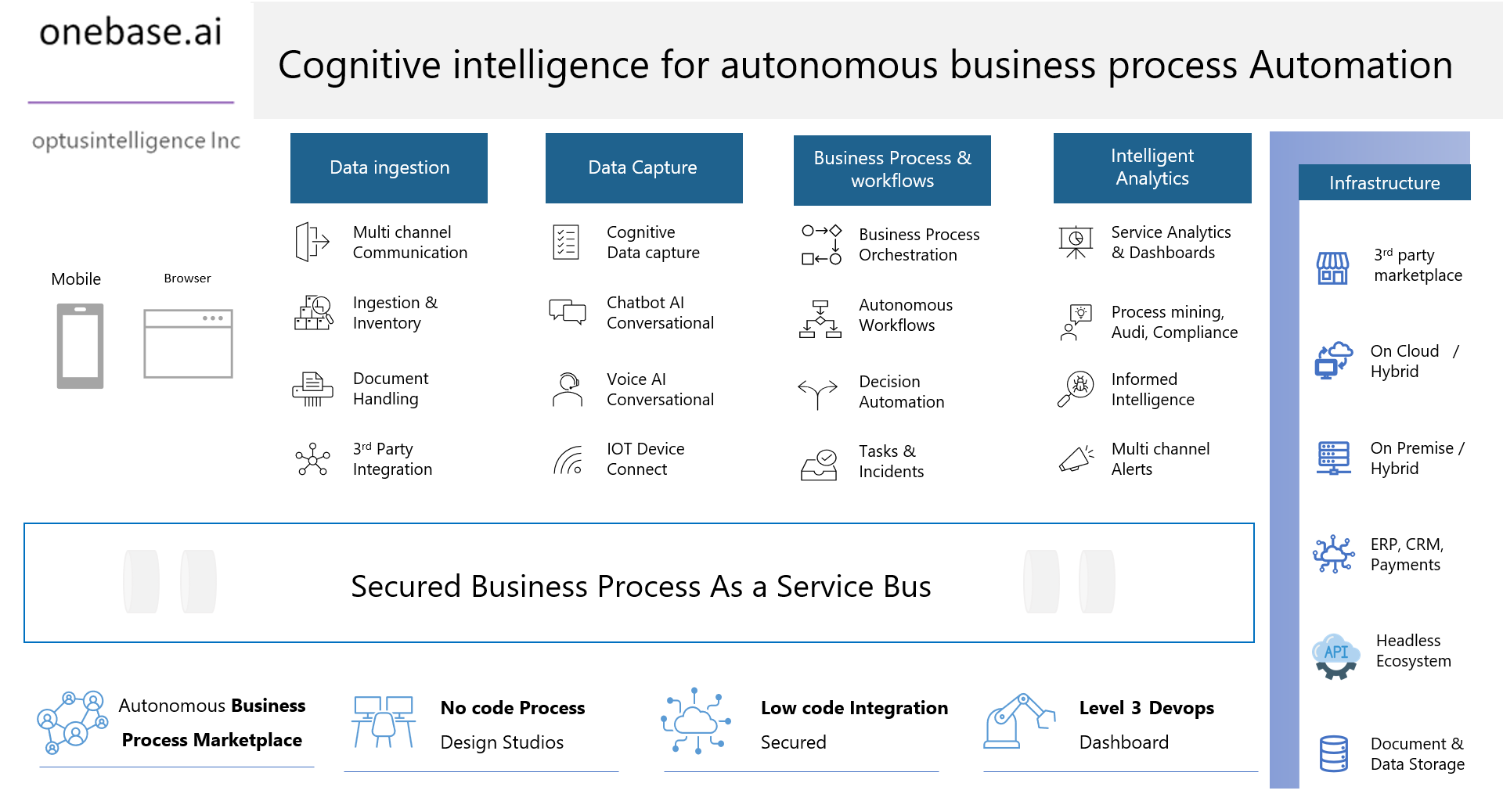 onebase by its Cognitive capabilities accepts input from forms or device or Apps seamlessly. Cognitive data capture on unstructured PDF, Excel Spreadsheets, EDI or from devices and apps. Seamless transformation of data capture by server side by Cognitive data robots. Greatly reduces need for real estate cost of physical presence of data capture analysts. Cognitive intelligence for multipage, multiline, Spreadsheet with unstructured columns and positions and texts.